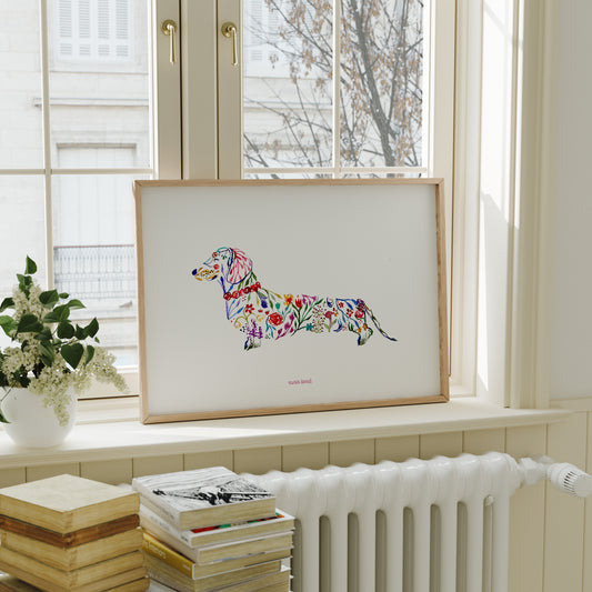 Print Perro Salchicha Flores Acuarela