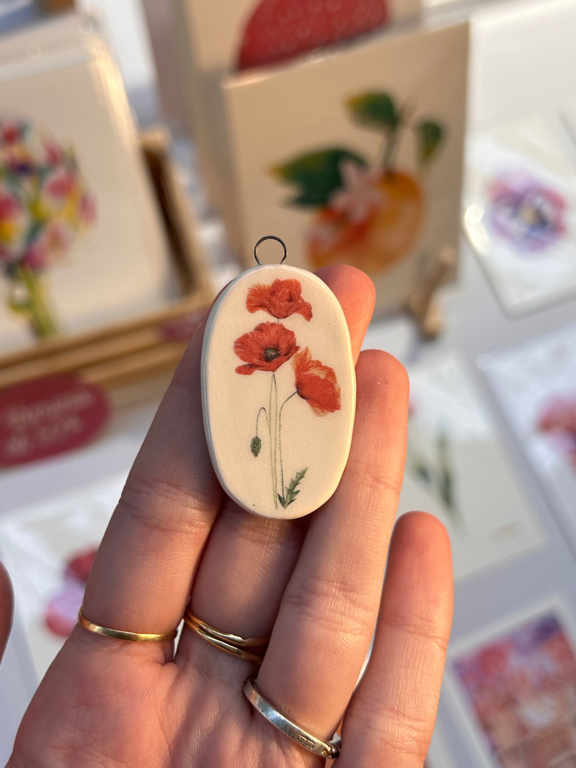 Colgante de cerámica 100% artesanal, de 4,5x 2,5cm aproximadamente, con transferencia del diseño “Amapolas”, creado a partir de una ilustración original en acuarela.
