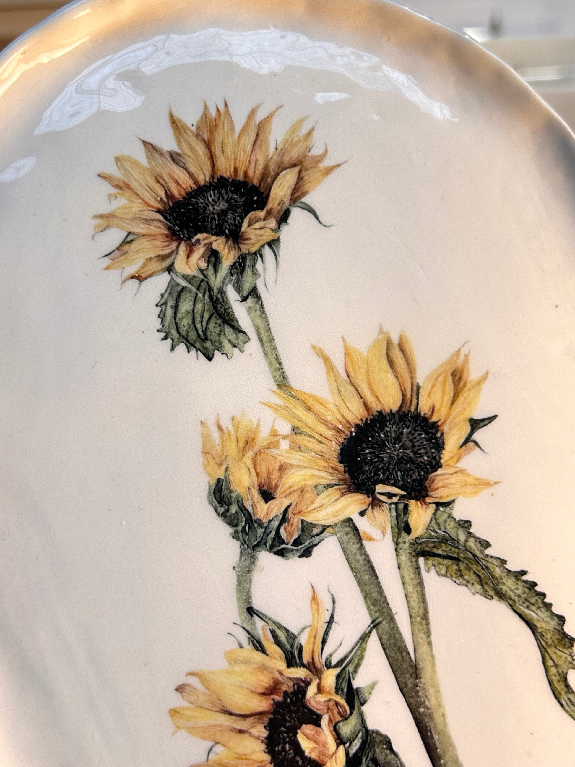 Plato de cerámica 100% artesanal, de 20x14,5cm aproximadamente, con transferencia del diseño “Girasol”, creado a partir de una ilustración original en acuarela.
