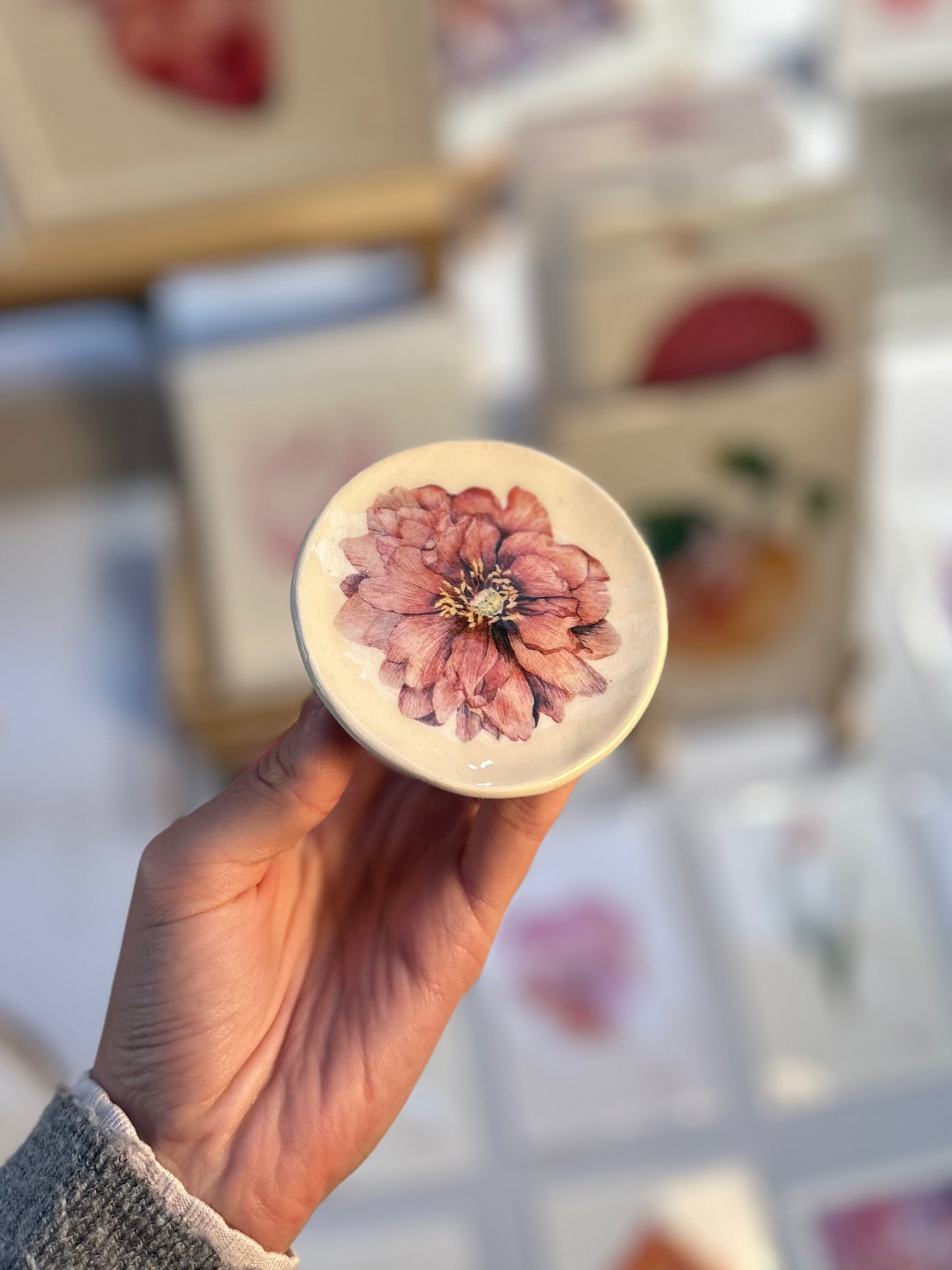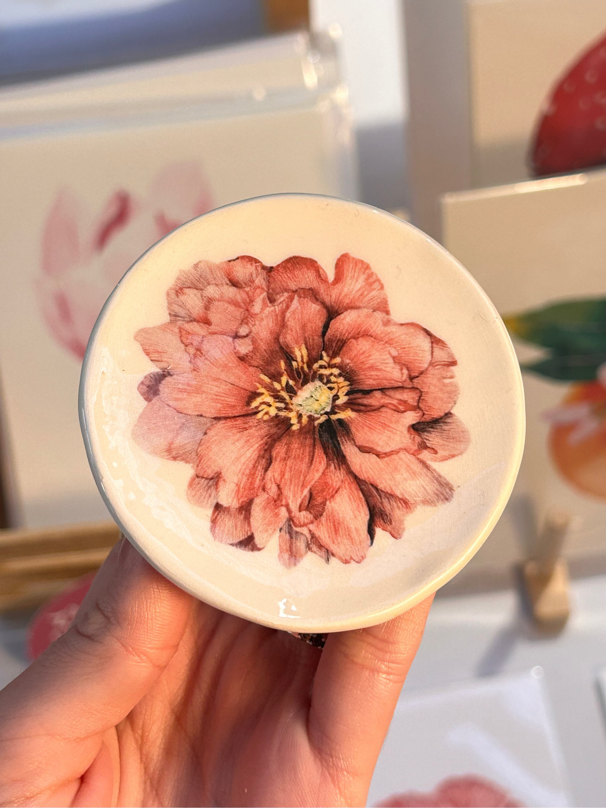 Plato de cerámica 100% artesanal, de 7,5cm aproximadamente, con transferencia del diseño “Peonía”, creado a partir de una ilustración original en acuarela.