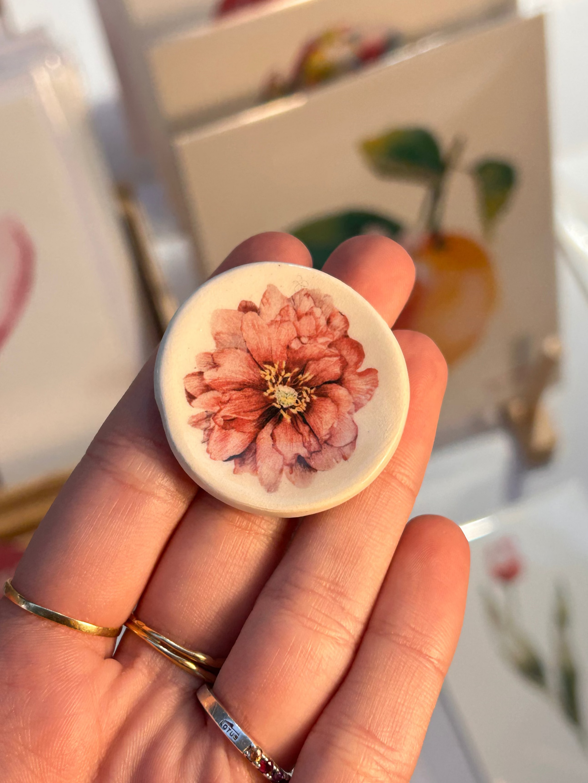Plato de cerámica 100% artesanal, de 3,5cm aproximadamente, con transferencia del diseño “Peonía”, creado a partir de una ilustración original en acuarela.