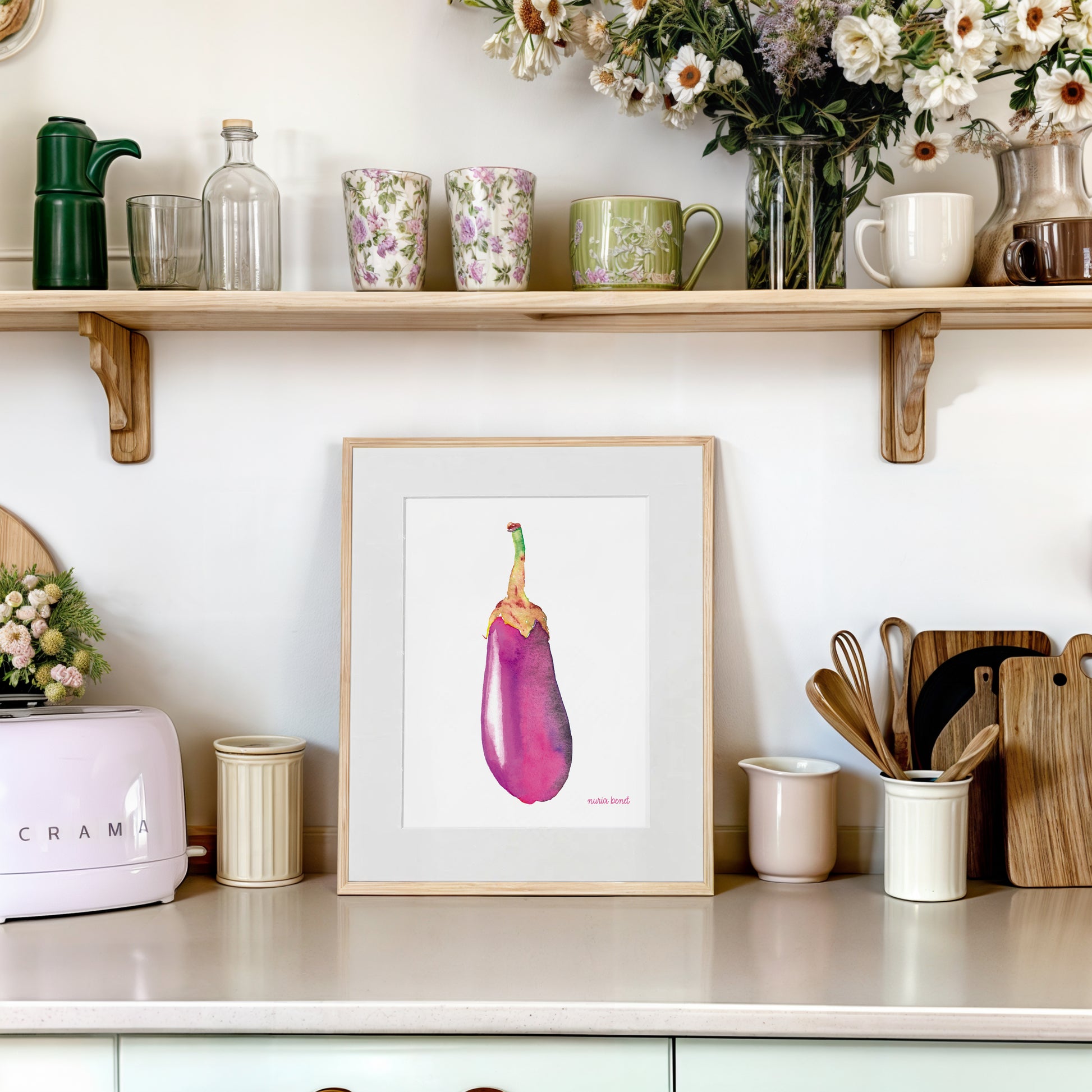 Impresión con el diseño Berenjena. Lámina original realizada en enero de 2023 con acuarelas Schmincke en papel de 300g. Impresión de calidad en papel verjurado de 300g tamaño A5 aproximadamente(15x20cm). También se puede comprar ya enmarcado.