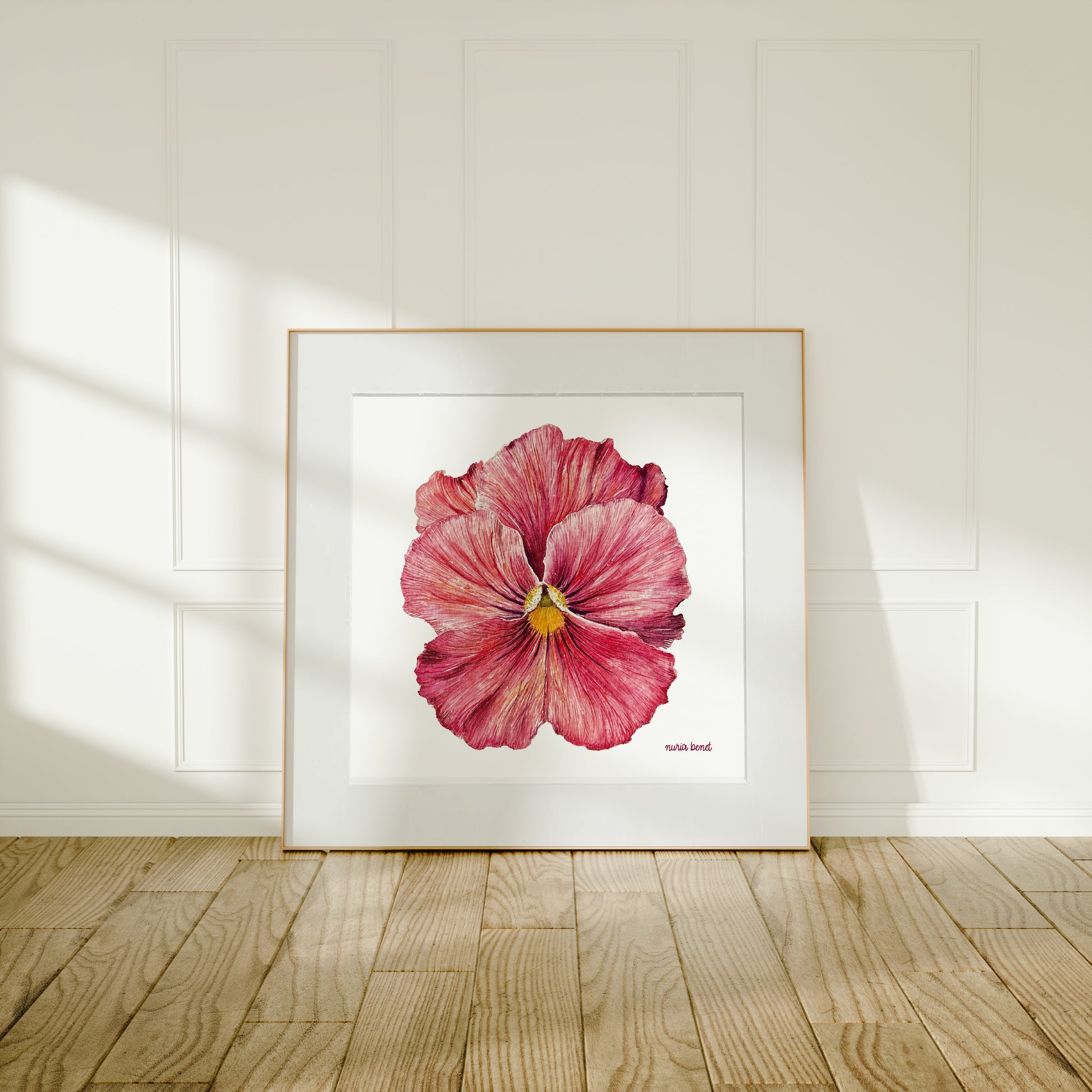 Impresión con el diseño Flor del Pensamiento, obra original realizada en febrero de 2024 con acuarelas Schmincke. Print disponible en tamaño 20x20xcm, impresión de calidad en papel verjurado de 300g. También se puede comprar ya enmarcado.